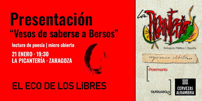 Esta plaquette se presentará junto con la inauguración de la exposición colectiva El eco de los libres en La Picantería (C/San Lorenzo, 44; 50001 Zaragoza) el miércoles 21 de enero a las 19:30 horas. Durante el evento habrá lectura de poemas de los cuatro autores y micrófono abierto al que se podrá sumar todo aquel que tenga algo que decir.
